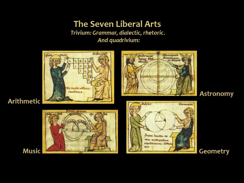 Son también llamadas liberales porque solo los hombres libres podían ejercerla. El quadrivium, abrazaba la aritmética, la geometría, la astronomía y la música. Son también llamadas liberales porque solo los hombres libres podían ejercerla... Las 7 artes liberales, trivium, quadrivium y falacias lógicas.